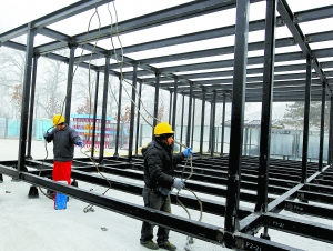 昨天,工人們?cè)谇迦A大學(xué)內(nèi)搭建“零耗能”住宅。從現(xiàn)在起至4月份,20名教授和50名學(xué)生將在清華游泳館東側(cè)的空地上搭建一所“零耗能”住宅,這是清華大學(xué)參加國(guó)際太陽能十項(xiàng)全能競(jìng)賽的作品。目前,房子的整體鋼結(jié)構(gòu)已經(jīng)搭建完畢。本報(bào)記者吳鏑攝