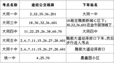 據(jù)市公交公司運調(diào)處負責人介紹,市區(qū)范圍內(nèi)參加“愛心送考”的公交車共有382臺,線路涉及21條。其中,大同一中、大同四中兩個考點的下車站名就是學校本名。大同三中考點的下車站名根據(jù)所乘線路不同有兩個。乘坐18路的考生和家長,在魏都新城C區(qū)下車;乘坐30路、32路、36路、601路的考生和家長,在金牛裝飾城下車,步行一段進入考點。大同五中考點因局部道路封閉,只能在魏都大道迎澤街口下車,然后步行進入。大同十中考點的下車站名為魏都大道迎澤街口。鐵一中考點的下車站名為嘉鑫園小區(qū)。