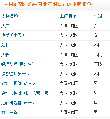 您當(dāng)前的位置:大同人才網(wǎng) >> 大同人才網(wǎng)資訊 >> 招聘公告 >> 大同市南郊蝸牛商業(yè)有限公司